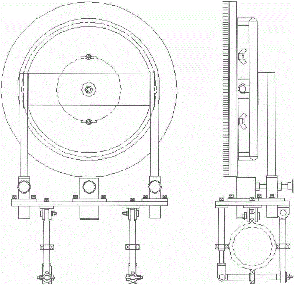 所述固定組件包括螺桿組件1,螺桿組件1上設(shè)置有滾輪3,將三根螺桿組件1通過(guò)螺栓進(jìn)行連接,再將其兩端均設(shè)置在安裝板2的下方;三根螺桿組件1和安裝板2構(gòu)成矩形結(jié)構(gòu),在螺桿組件1與安裝板2連接處的中間位置處安裝上滾輪組件4,上滾輪組件4安裝在安裝板下方,與固定手輪5連接,固定手輪5設(shè)置在安裝板2的上方。工作時(shí)螺桿組件1上的滾輪3抱住起毛機(jī)的連接鋼管,再利用固定手輪5調(diào)節(jié)使上滾輪組件4的滾輪抱住起毛機(jī)的連接鋼管,進(jìn)而實(shí)現(xiàn)整個(gè)支撐模塊在鋼管上滑動(dòng)。